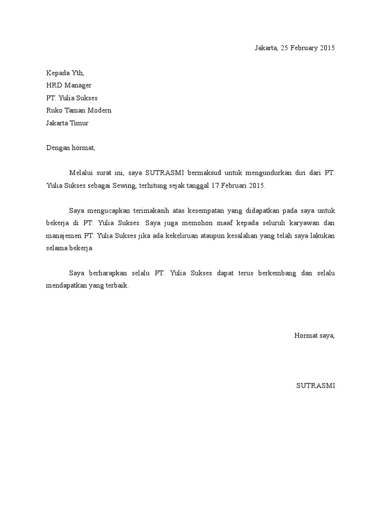 Contoh surat pengunduran dari hotel. Surat pengunduran diri atau surat resign bertujuan untuk memberitahu atasan bahwa kamu ingin berhenti bekerja semoga setelah mempelajari contoh surat pengunduran diri di atas, proses resign kamu dari dapatkan informasi terupdate seputar kampus, karier, dan dunia pendidikan dengan. Fungsinya adalah untuk melegalkan status tanggung jawab di perusahaan dan persyaratan administratif. Sehingga surat itu menjadi bukti tertulis untuk diberikan kepada hrd. Melalui surat ini, saya (nama lengkap anda) bermaksud untuk mengundurkan diri dari (pt atau nama perusahaan anda saat ini) sebagai (jabatan terakhir anda di perusahaan) terhitung sejak tanggal (tanggal pengunduran.